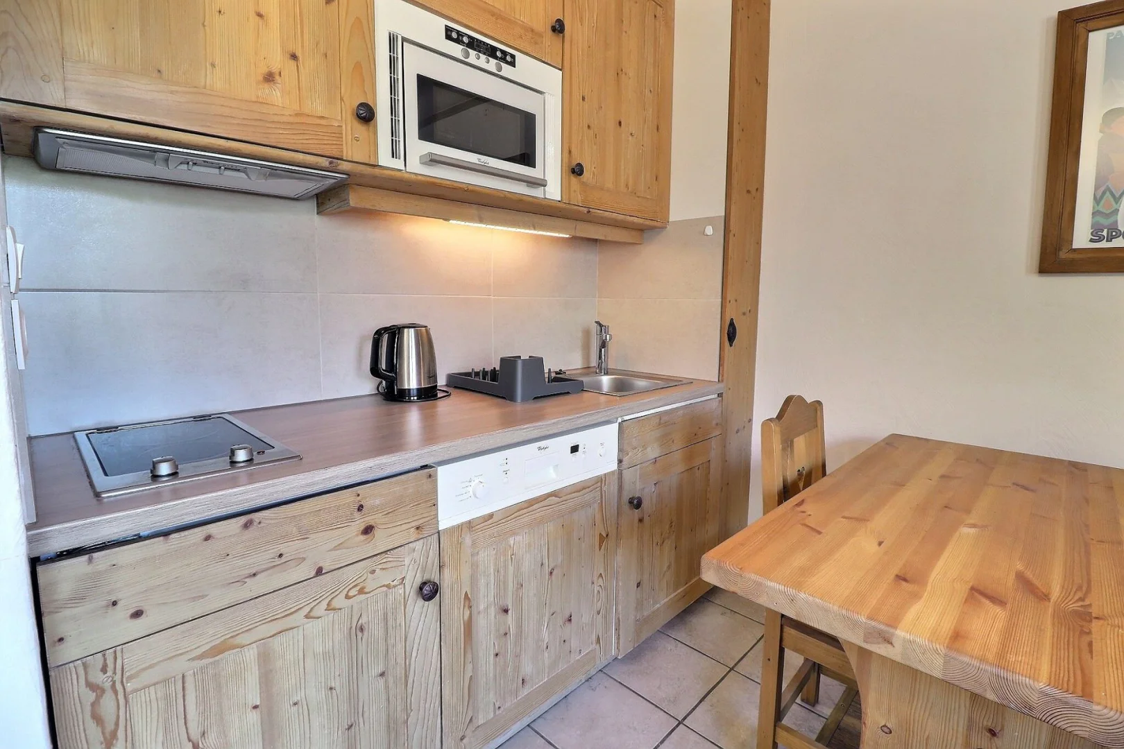 Open kitchen: oven with micro-waves, fridge, 2 ceramic hobs, dishwasher, filter coffee machine, toaster, electric kettle, hood