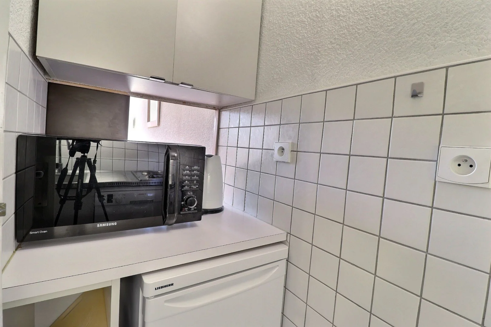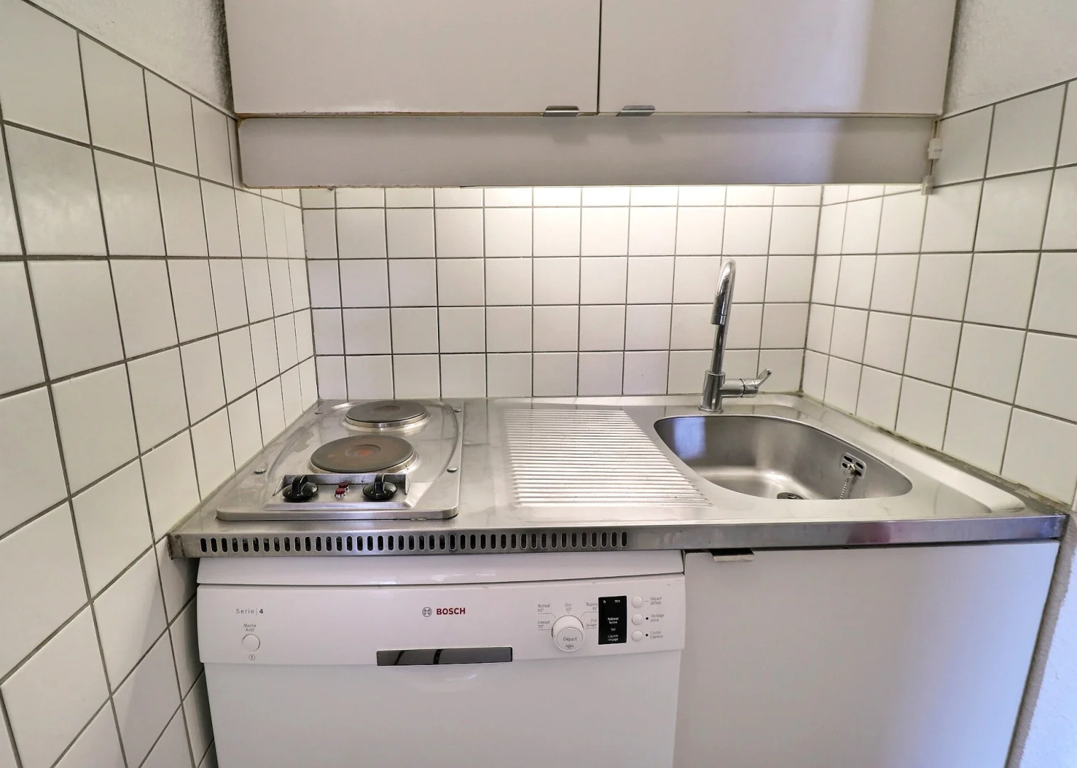 Kitchen corner: oven with micro-waves, fridge, 2 hot plates, dishwasher, filter coffee machine Krups, toaster, electric kettle
