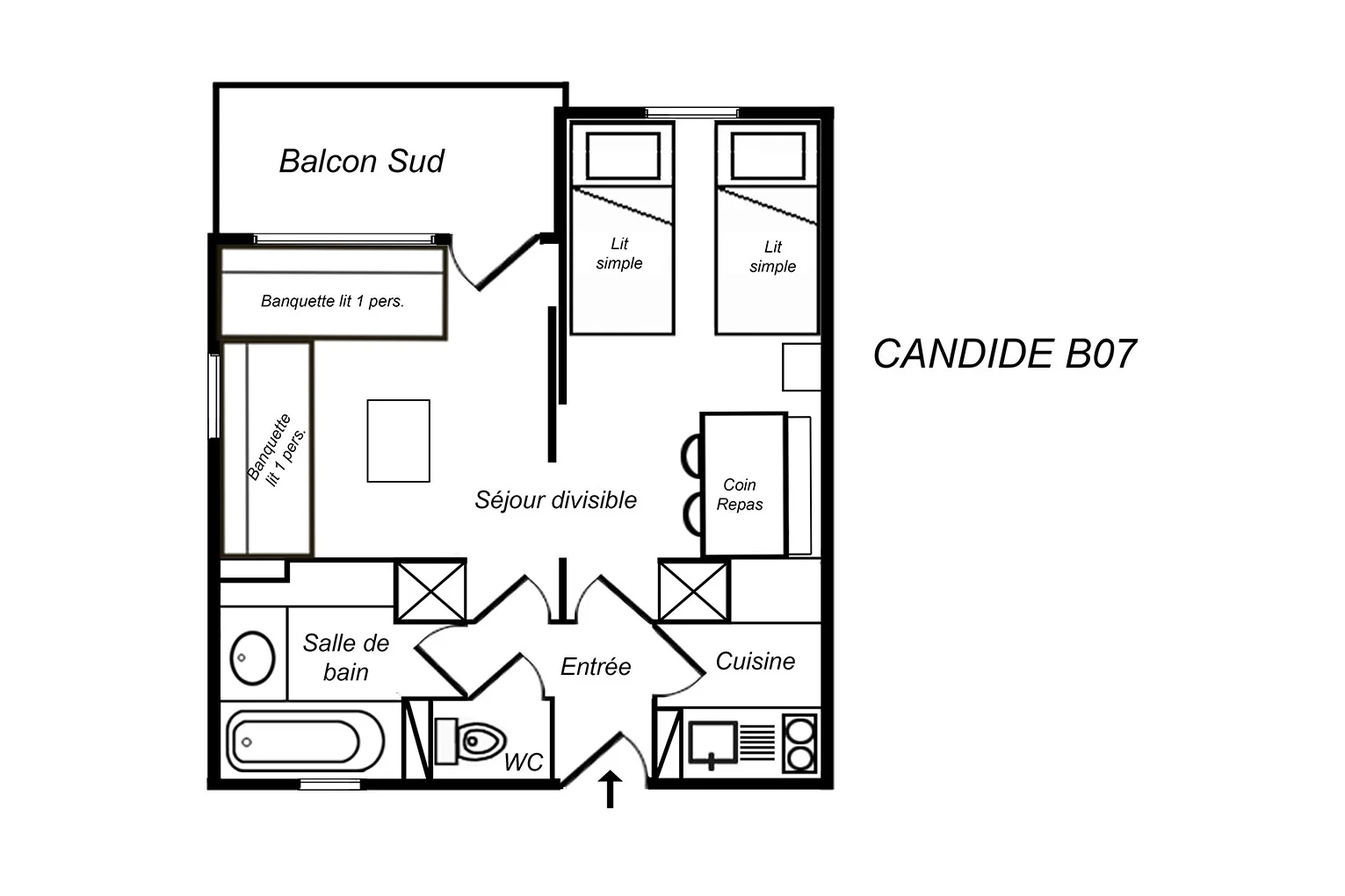Divided studio, 4 Persons, 27m², South Balcony, 3rd Floor