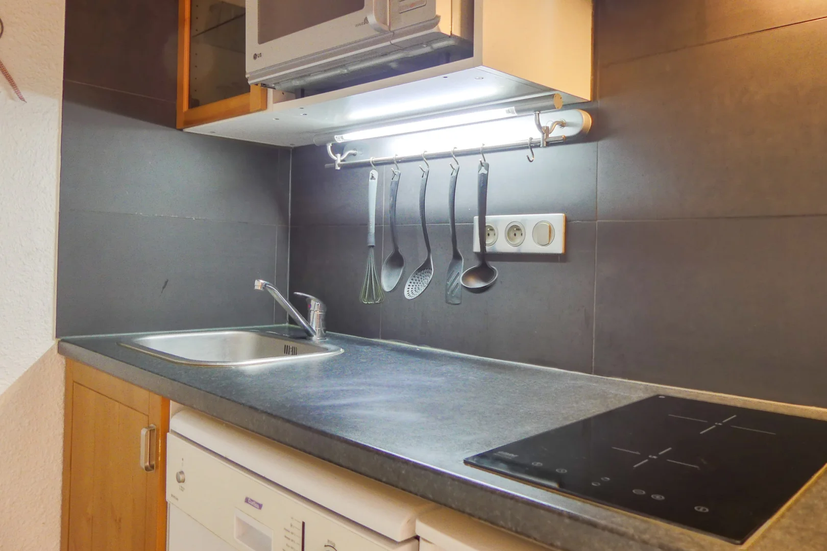 Kitchen corner: micro-waves with a grill, fridge, dishwasher, 2 induction hobs, hood, coffee machine with thermos, toaster, electric kettle