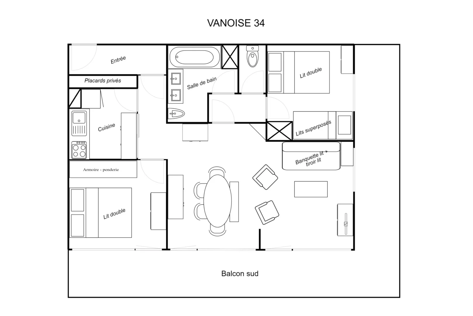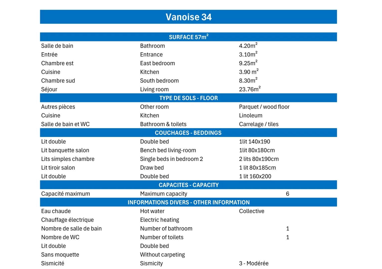 3 Rooms, 5/6 persons, 57m², South Balcony, 4th Floor