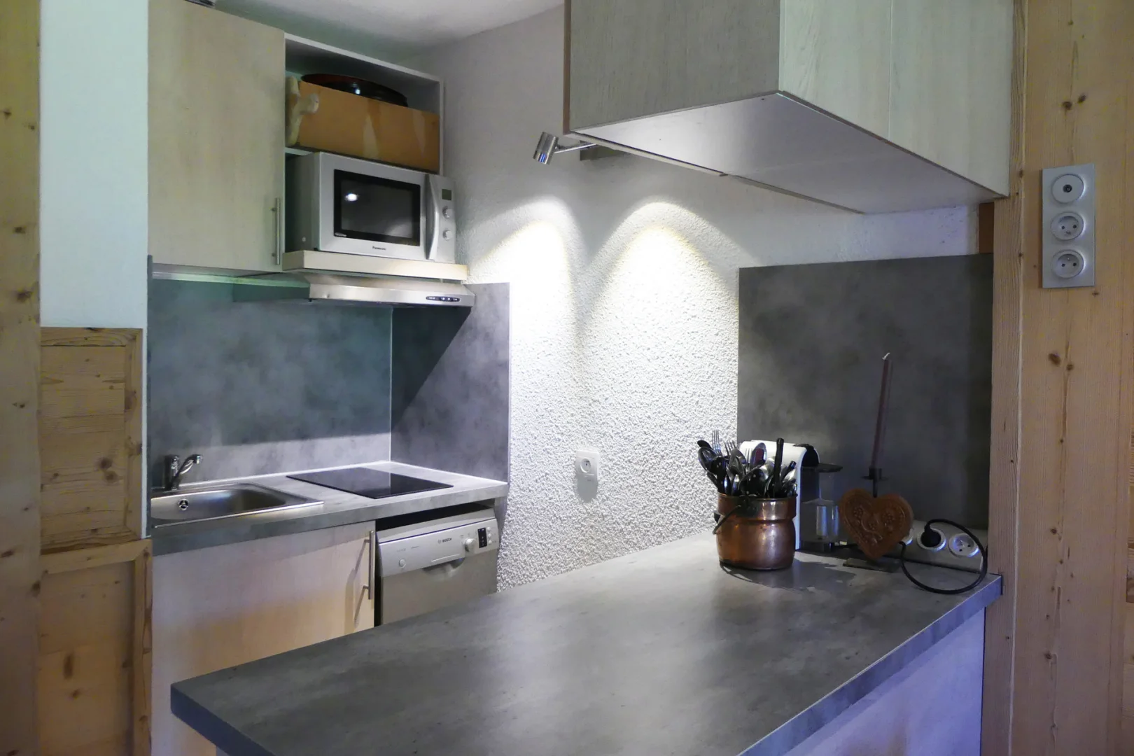 Open kitchen: oven with micro-waves, fridge, 2 ceramic hobs, dishwasher, filter coffee machine, electric kettle, hood