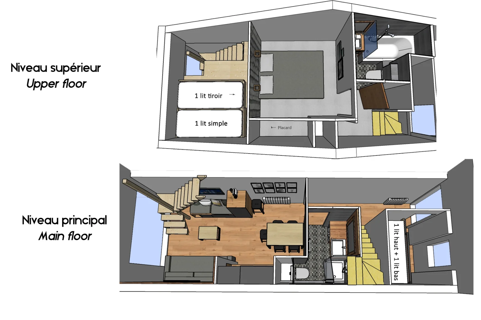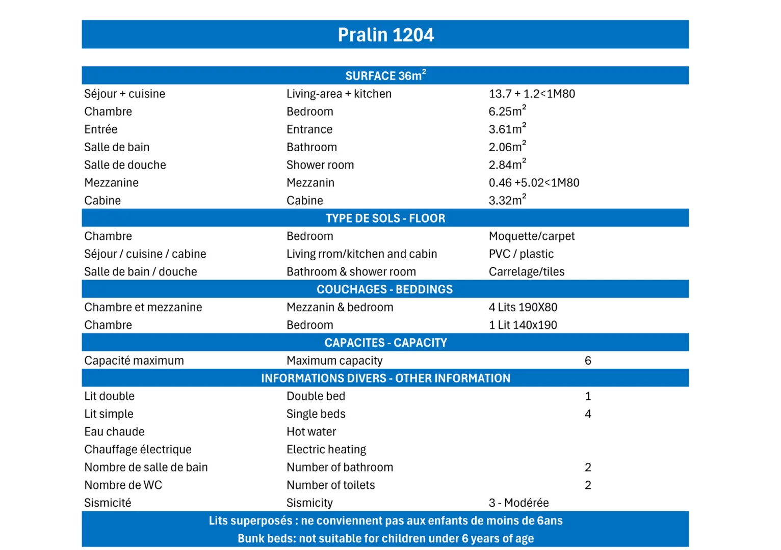 Mezzanin open on the livingroom: 1 bed (190x80) and 1 pull out bed (190x80)