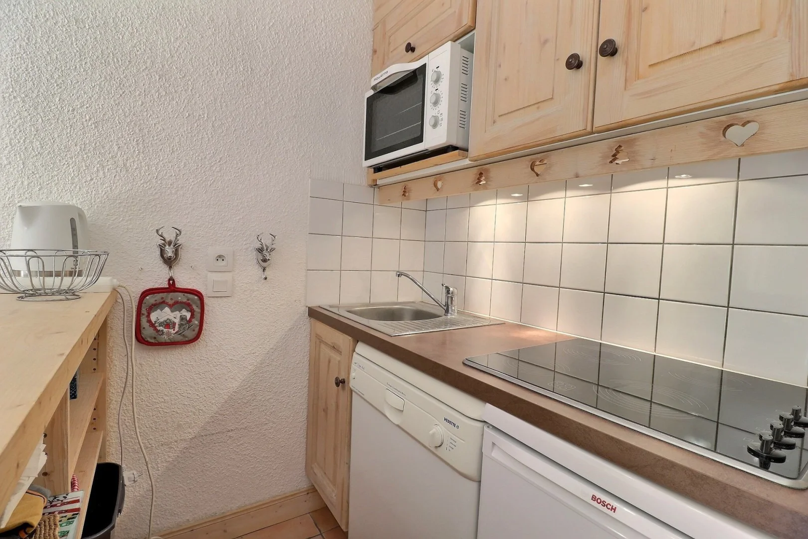 Kitchen corner : oven micro waves, fridge, dishwasher, 4 ceramic hobs, filter coffee machine, Nespresso coffee machine, toaster, electric kettle