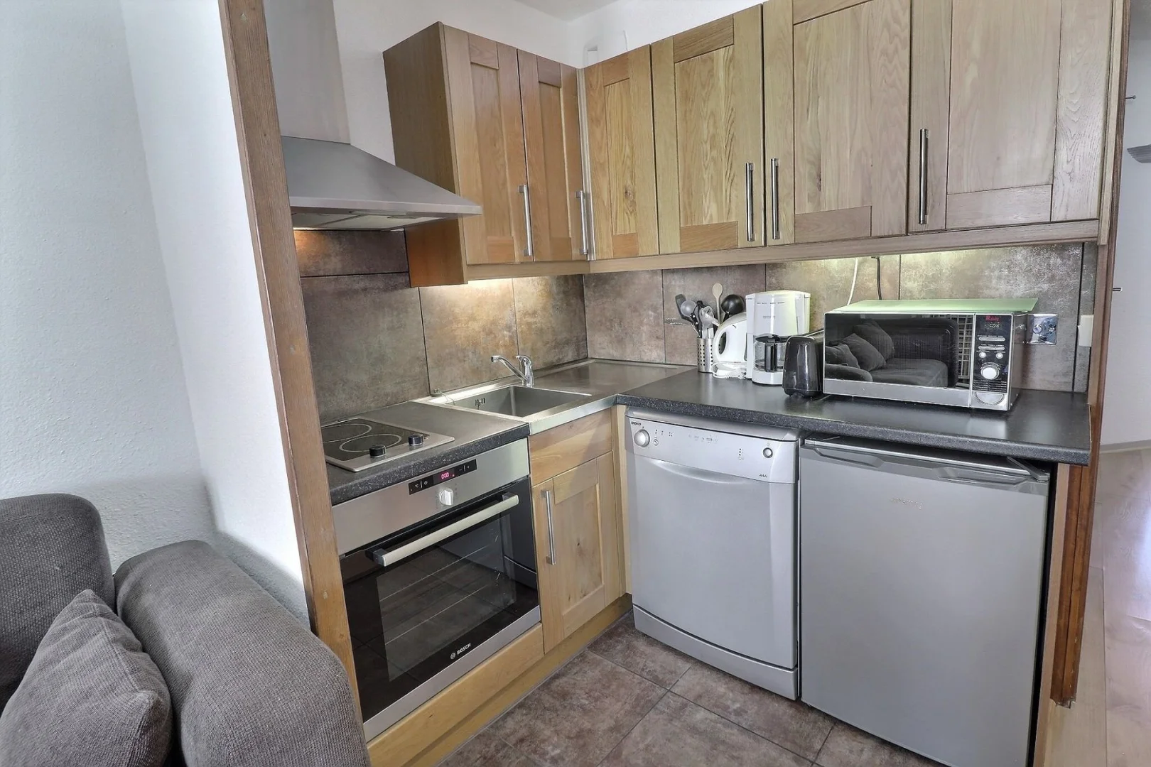 Kitchen corner: oven with micro-waves, fridge, dishwasher, 2 ceramic hobs, hood, normal coffee machine