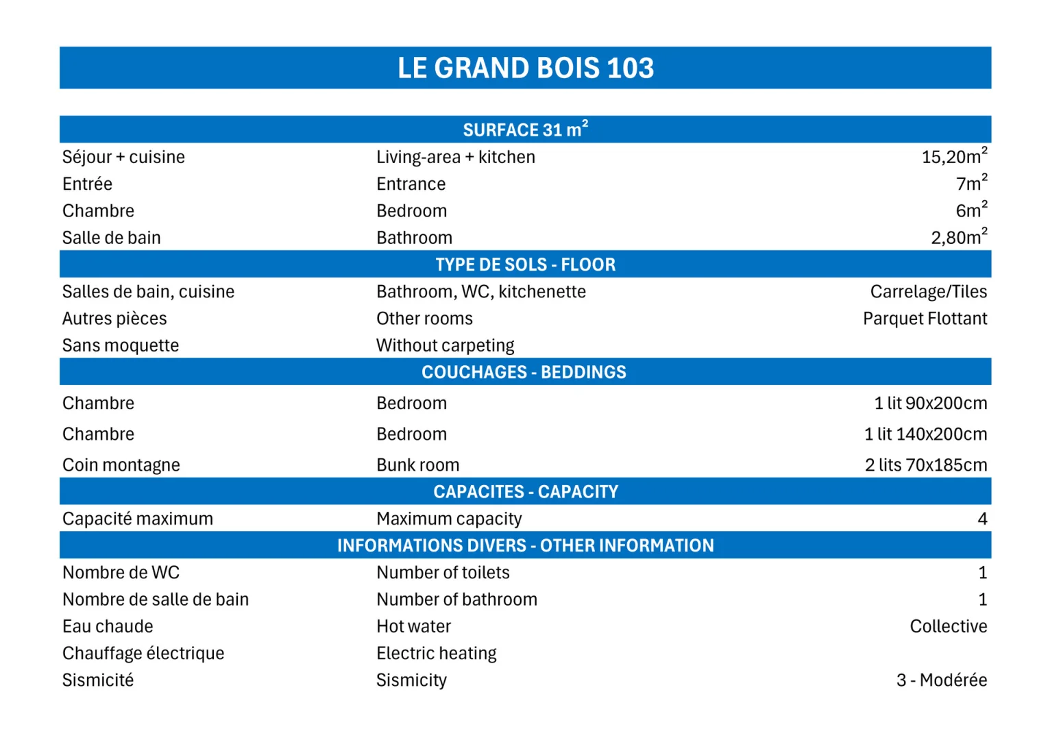 Bedroom: 1 double bed (140x200cm) and 1 single bunk bed (90x200cm)