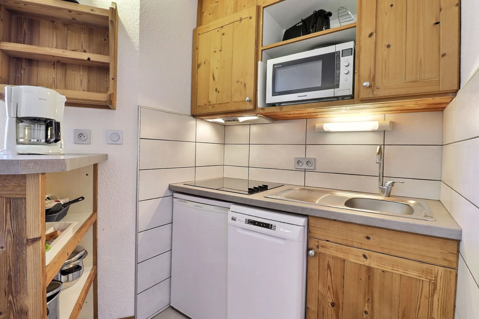 Open kitchen: oven with micro-waves, fridge, dishwasher, 4 ceramic hobs, hood