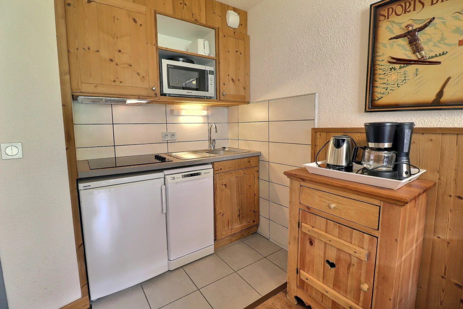 Kitchen corner: oven with micro-waves, fridge, dishwasher, 4 ceramic hobs, hood, normal coffee machine