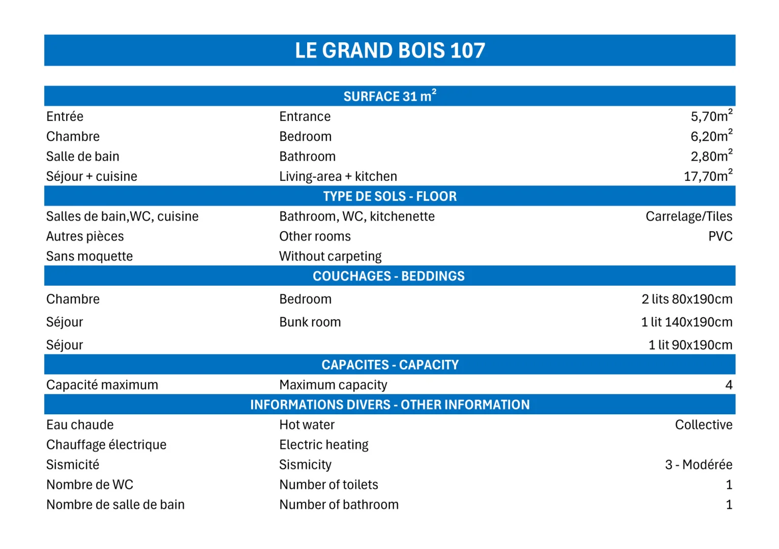 2 Rooms, 4 persons, 31m², West Balcony, 1st Floor