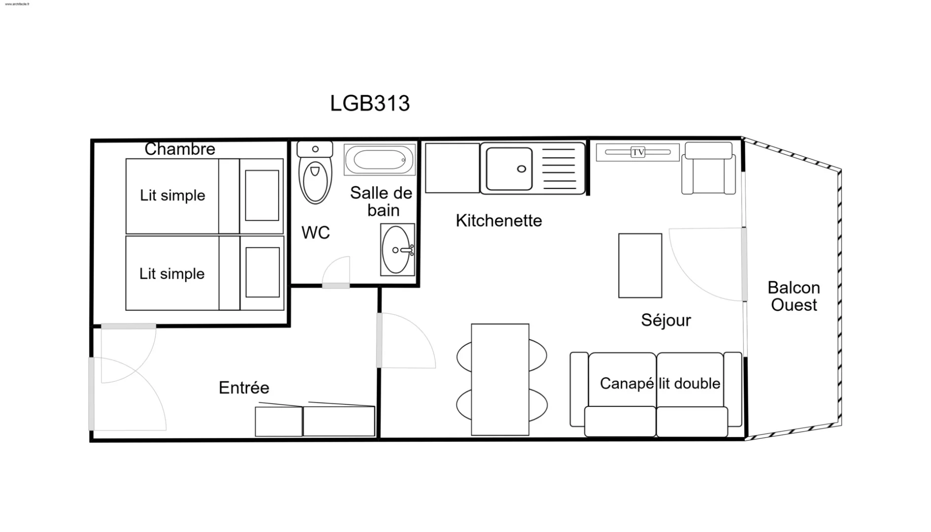 2 Rooms, 4 Personnes, 25m², West balcony, 1st floor