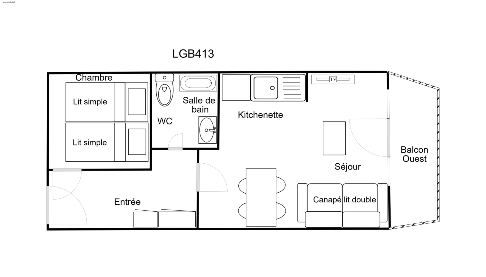 2 Rooms, 4 Personnes, 25m², West balcony, 2nd floor
