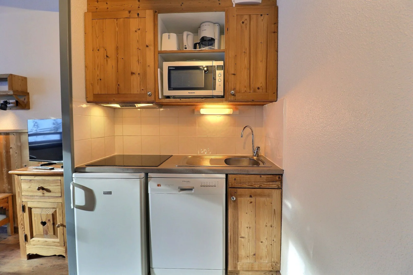 Kitchen corner: oven with micro-waves, fridge, dishwasher, 4 ceramic hobs, hood