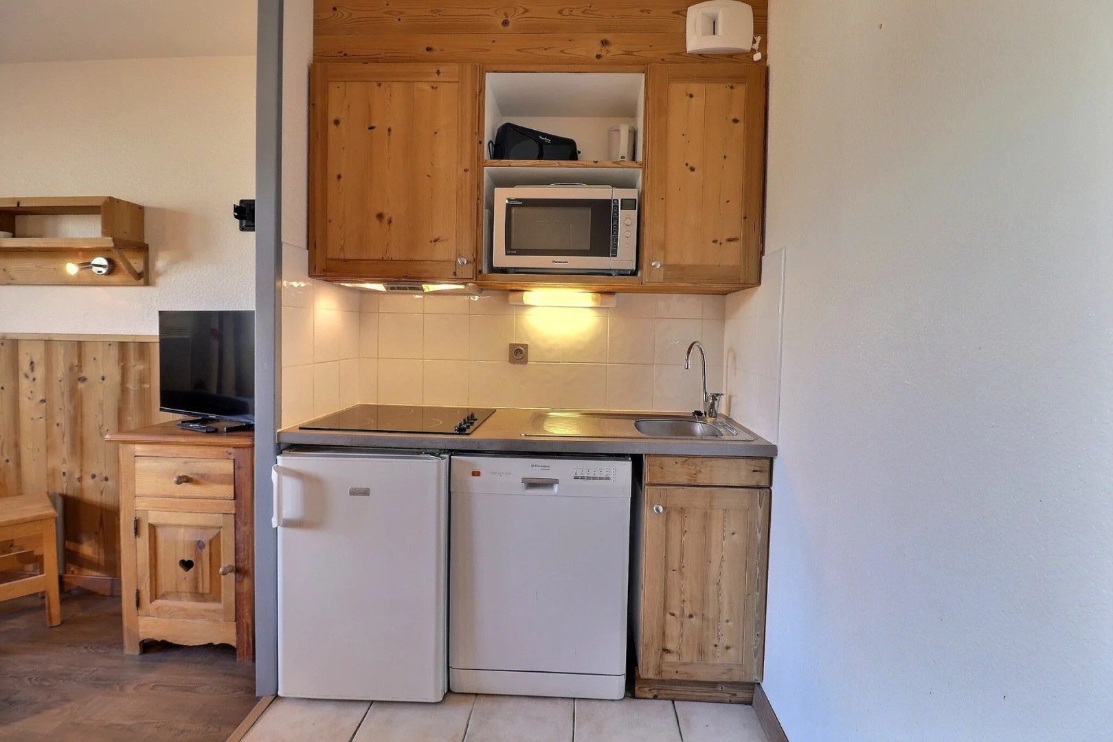 Kitchen corner: oven with micro-waves, fridge, dishwasher, 4 ceramic hobs, hood