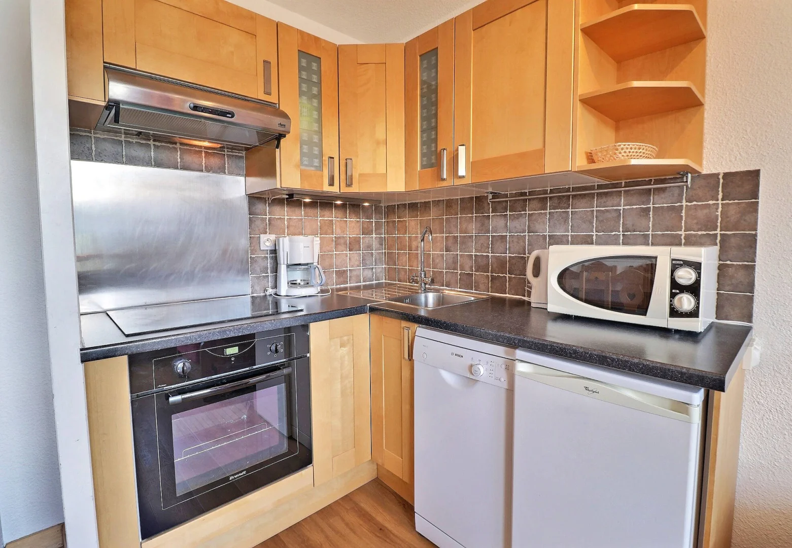 Kitchen corner: oven with micro-waves, fridge, dishwasher, 4 ceramic hobs, hood