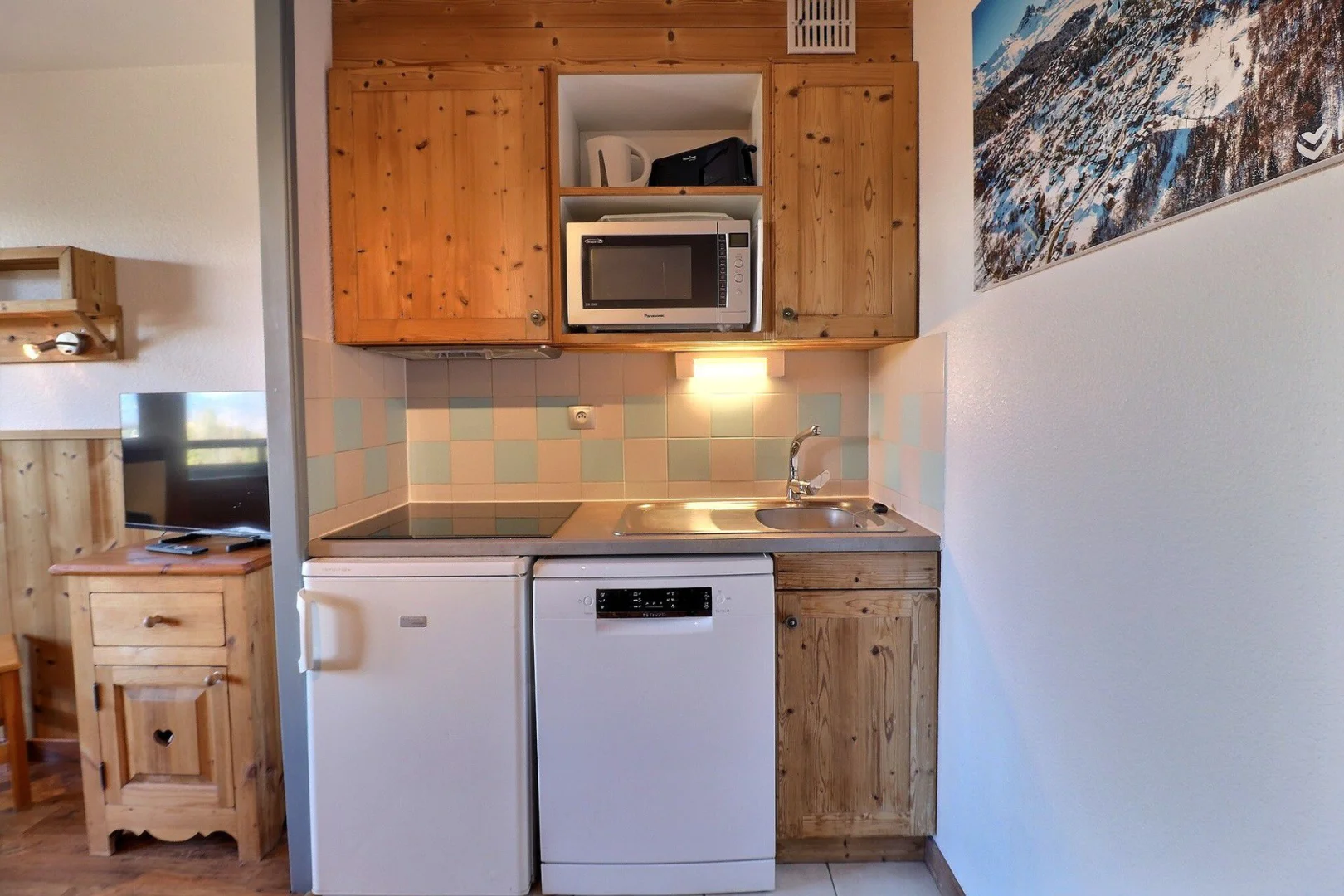 Kitchen corner: oven with micro-waves, fridge, dishwasher, 4 ceramic hobs, hood