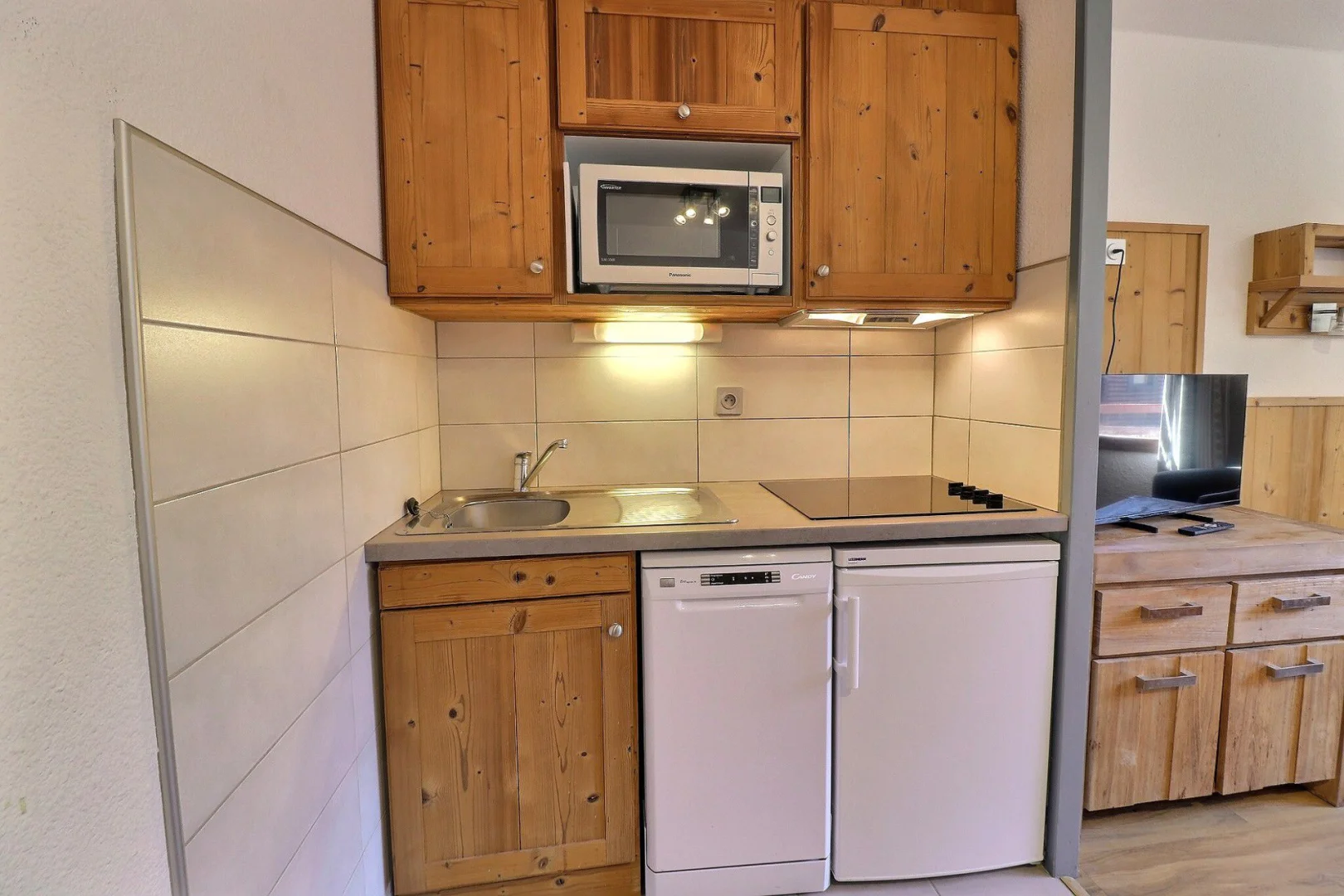 Kitchen corner: oven with micro-waves, fridge, dishwasher, 4 ceramic hobs, hood