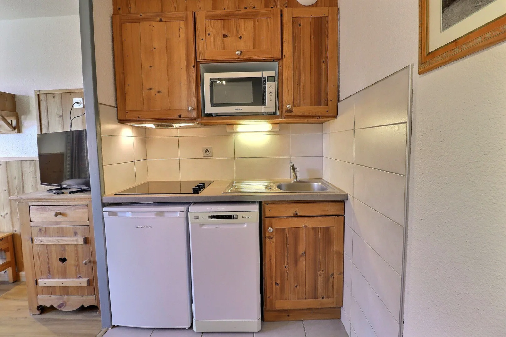 Kitchen corner: oven with micro-waves, fridge, dishwasher, 4 ceramic hobs, hood