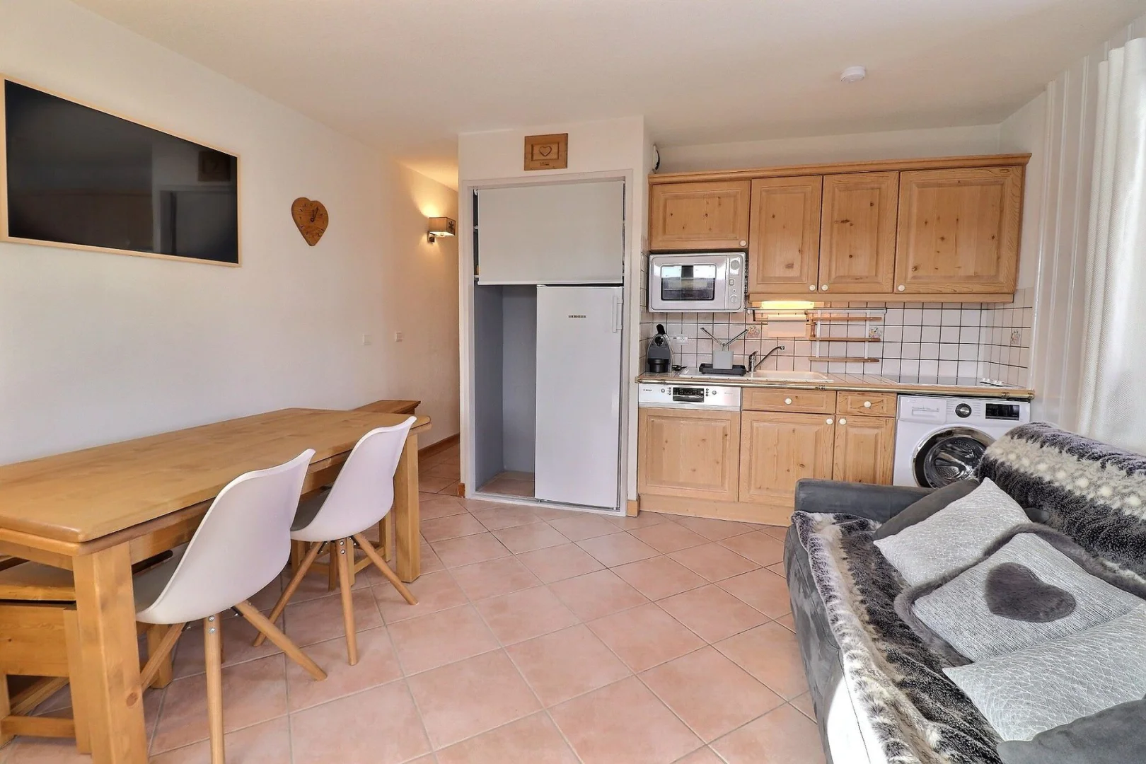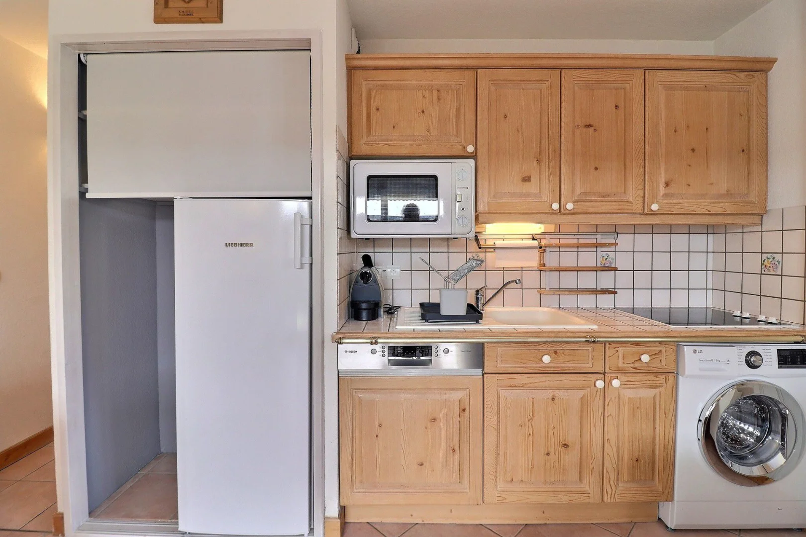 Open kitchenette : oven, fridge, dishwasher, 4 ceramic hobs, 1 Nespresso coffee machine, toaster, kettle, washing machine with dryer