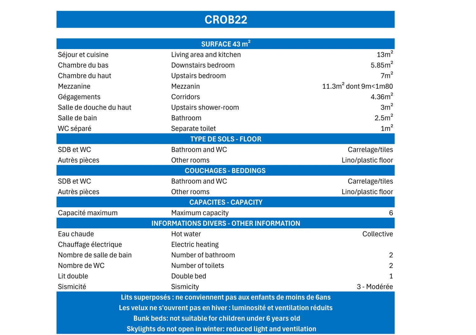Bedroom (with a skylight): 2 sets of bunk beds (80x 200 - 1 of 80x190)