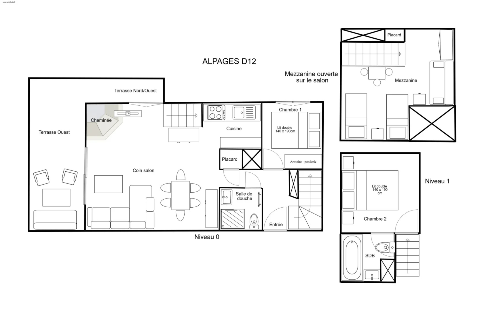 3 Rooms Duplex with mezzanine, 6/7 people, 62m², West-facing terrace