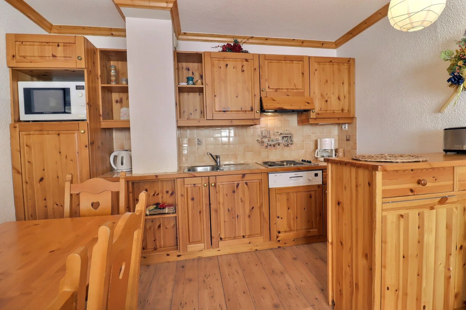 Open kitchen: oven with microwaves, fridge, dishwasher, 4 electric hobs, filter coffee machine, electric kettle, toaster, hood