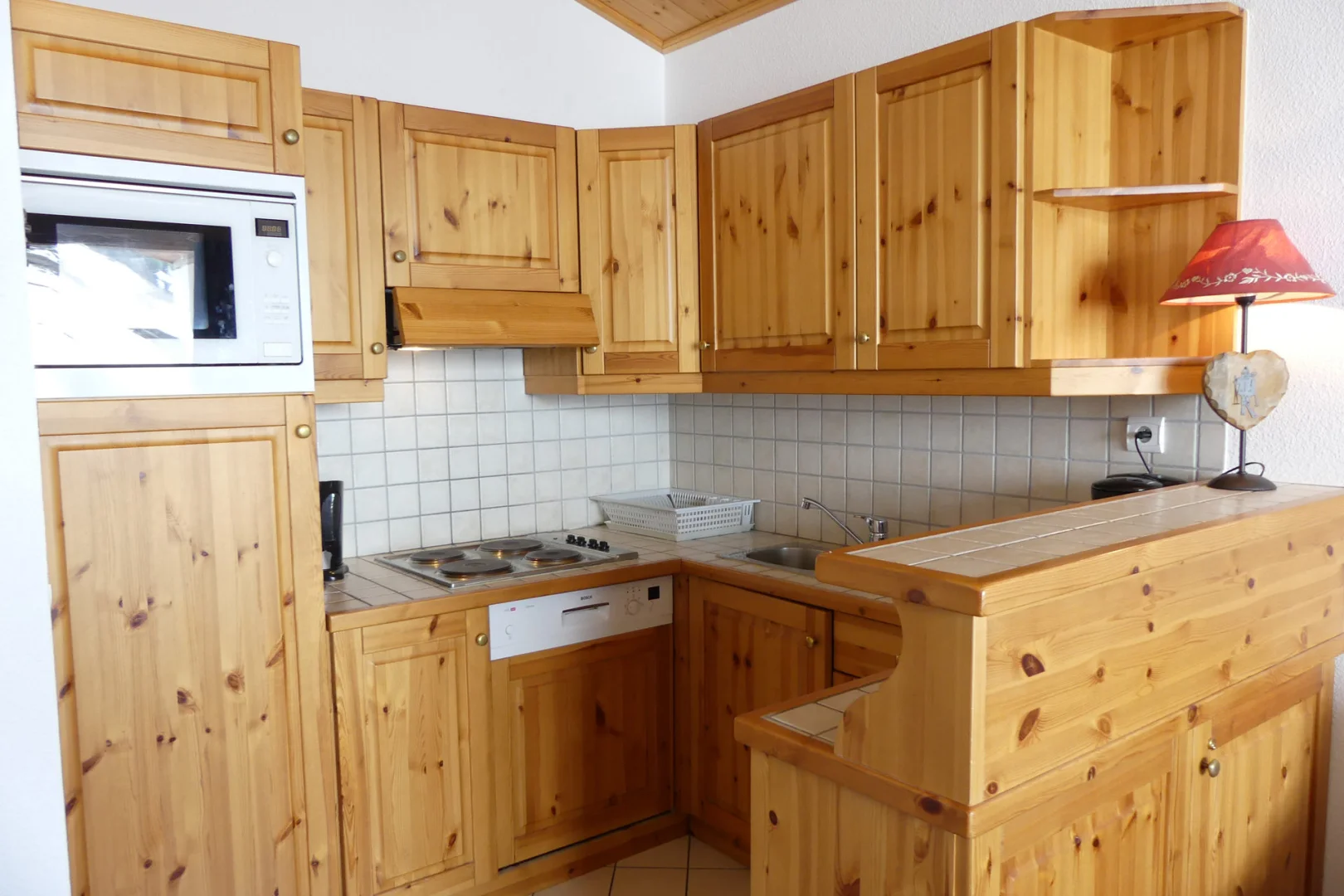 Kitchen with a bar: oven with micro-waves, fridge, dishwasher, 4 electric hot plates, hood, filter coffee machine, toaster, electric kettle