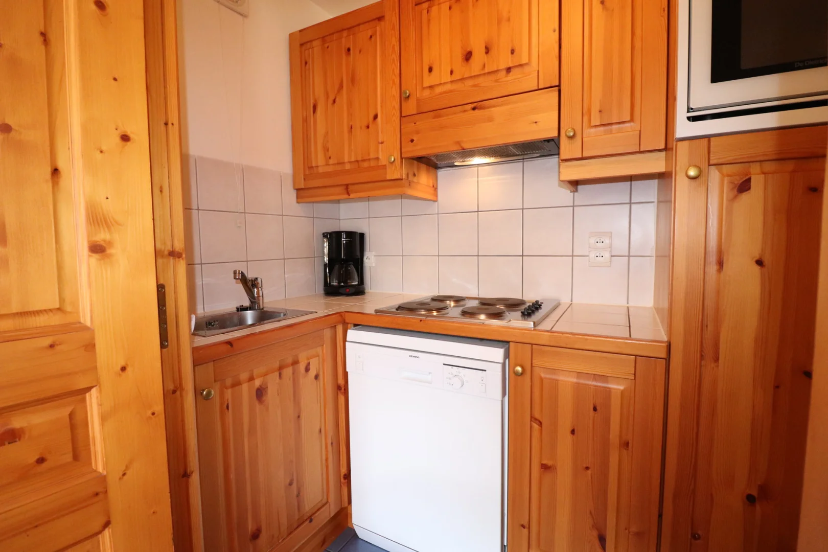 Kitchen corner: oven with micro-waves, fridge, dishwasher, 4 electric hot plates, hood, filter coffee machine, toaster, electric kettle