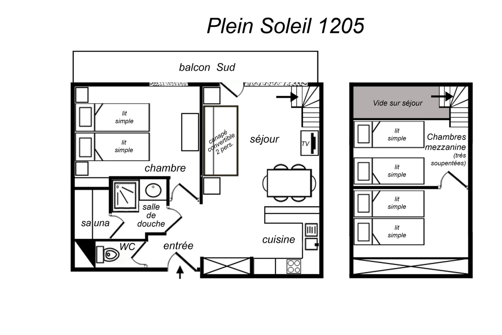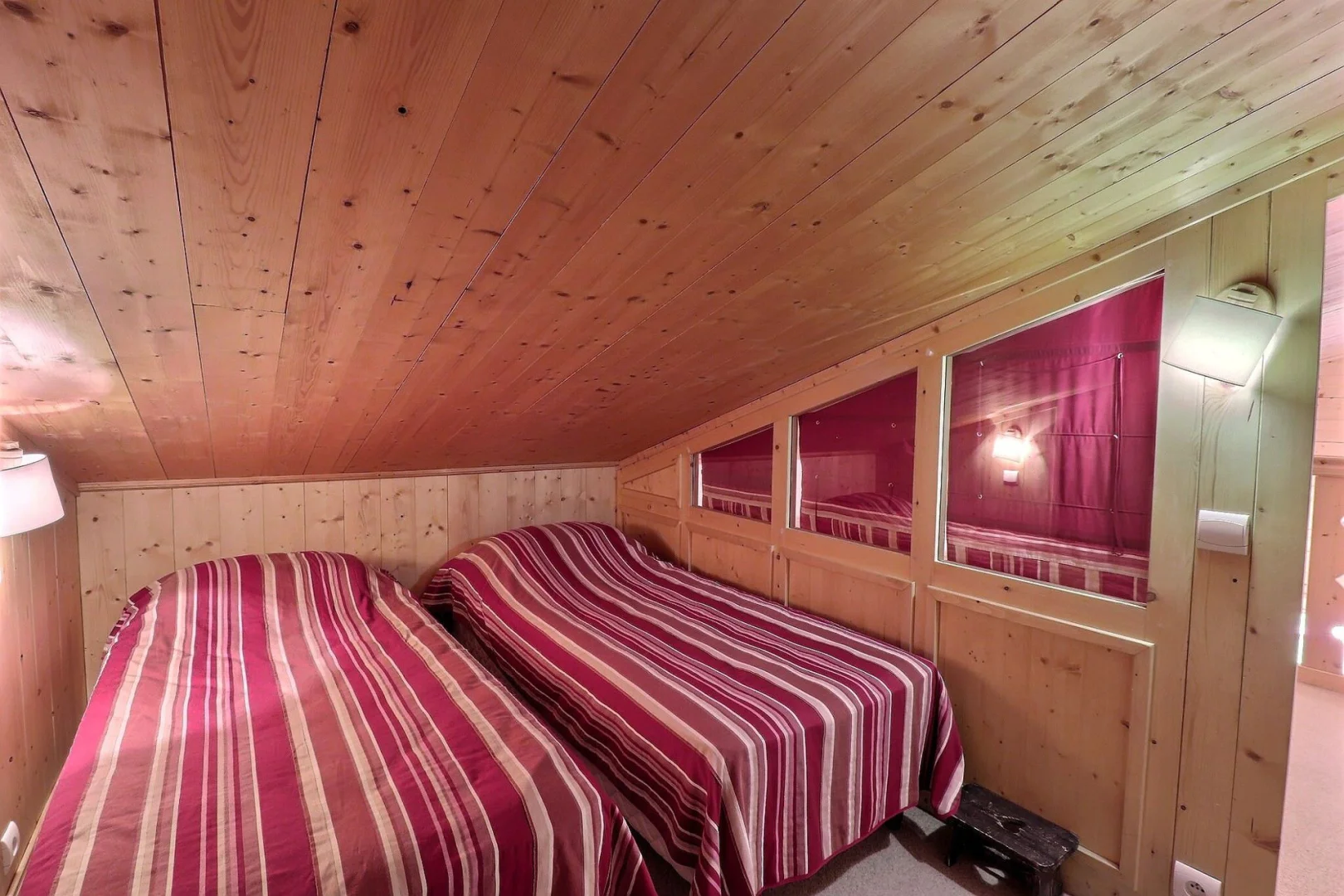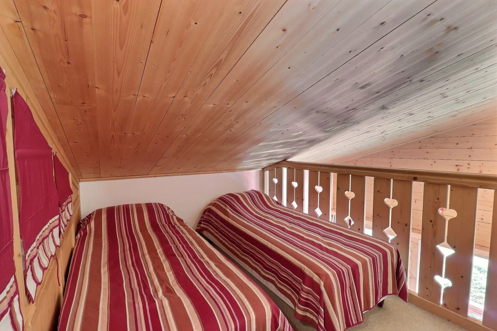 Mezzanine splitted into 2 sleeping areas: 1 cabin with sloping ceiling with 2 beds 1 person and 1 sleeping area open on the living-room: 2 beds 1 person