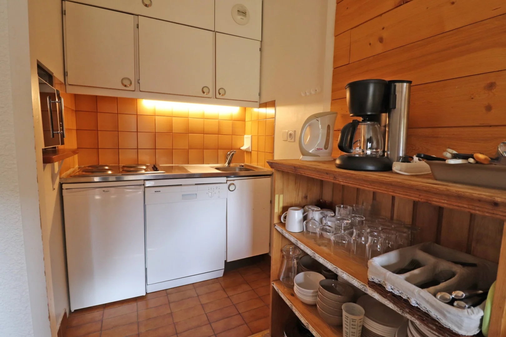 Kitchen corner: fridge, dishwasher, 4 hot plates, oven combined micro-waves and grill, filter coffee machine, toaster, electric kettle