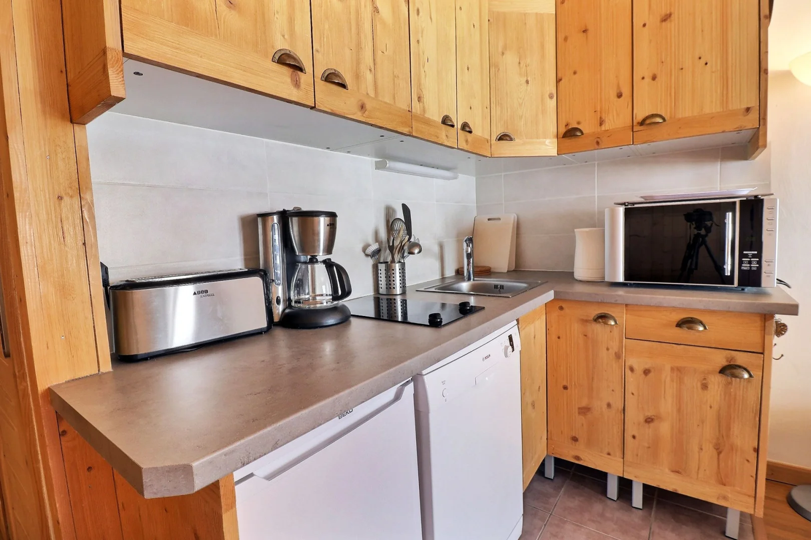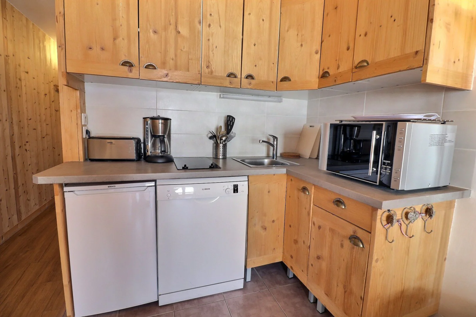 Kitchen corner : fridge, dishwasher, 2 ceramic hot plates, oven with micro-waves, filter coffee machine, toaster, electric kettle