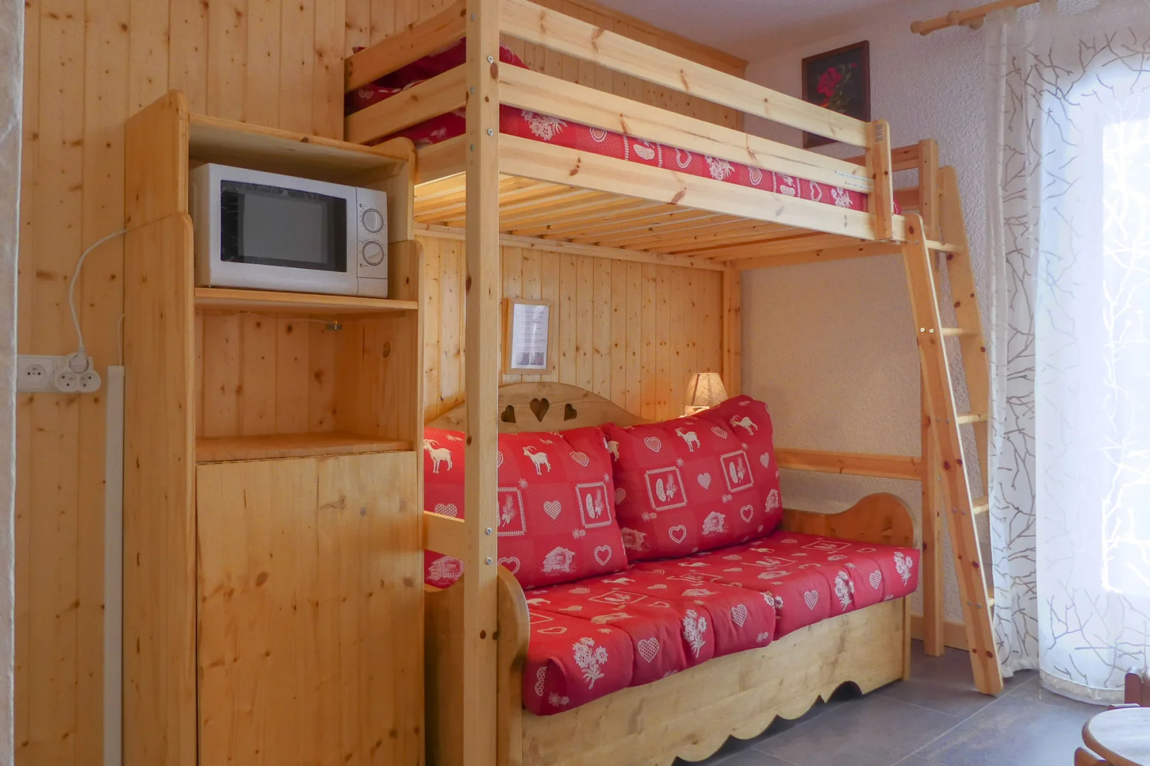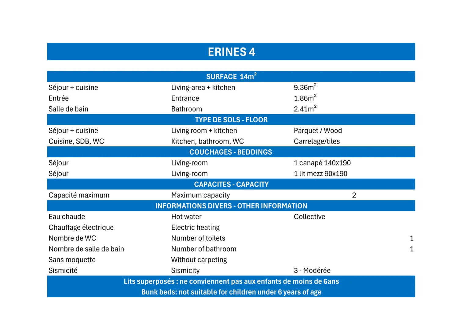 Living-room: 1 sofa bed for 2 persons (140x190), 1 bed for 1 person in mezzanine (90x190)