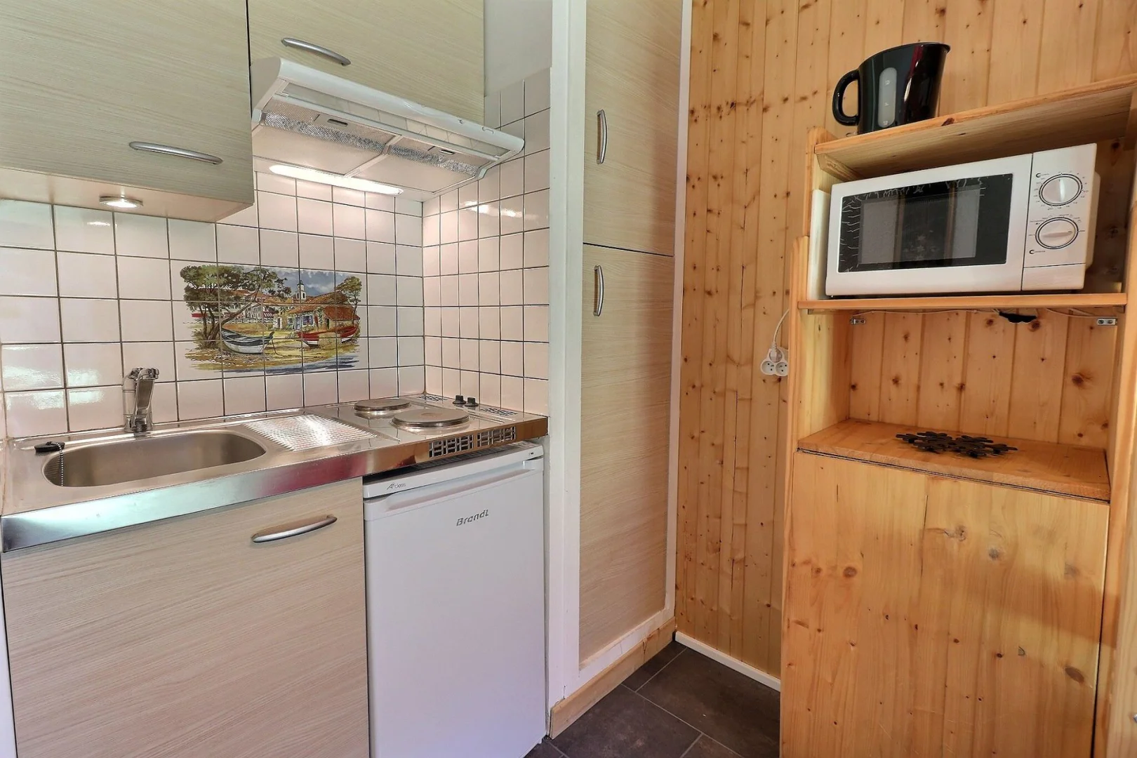 Kitchen: fridge, 2 hot plates, micro-waves, hood, filter coffee machine, 1 toaster, electric kettle