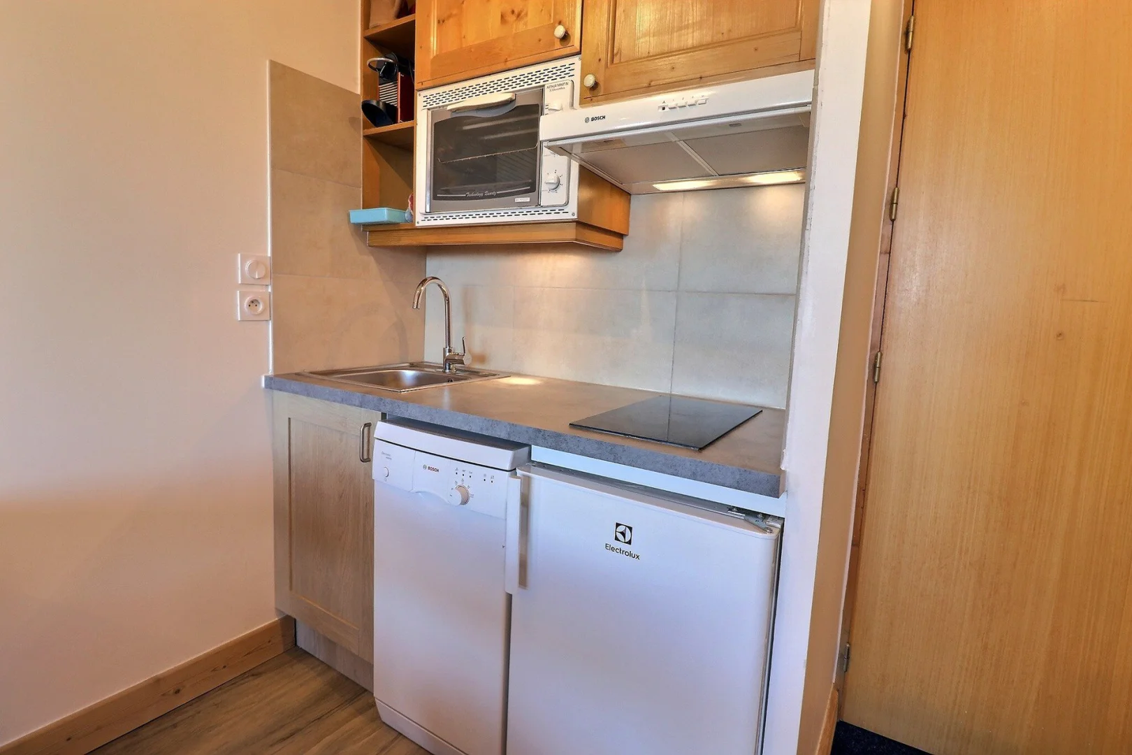 Kitchen corner: oven, fridge, 2 hot plates, dishwasher, hood, filter coffee machine, Nespress coffee machnine toaster, electric kettle