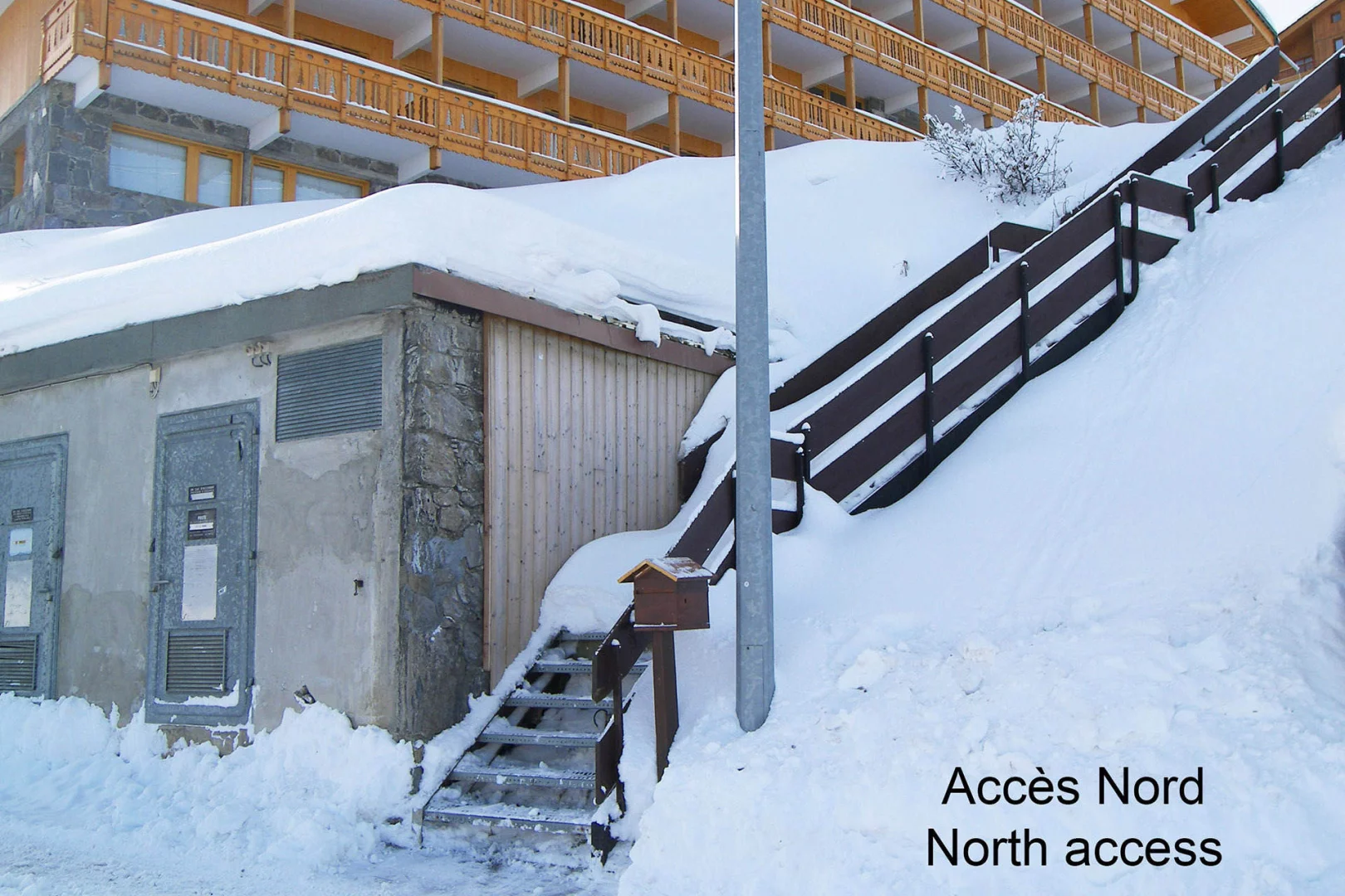 The commercial centre area is 500m far, going down the stairs or using the 200m-away "téléporté des chalets" lift.