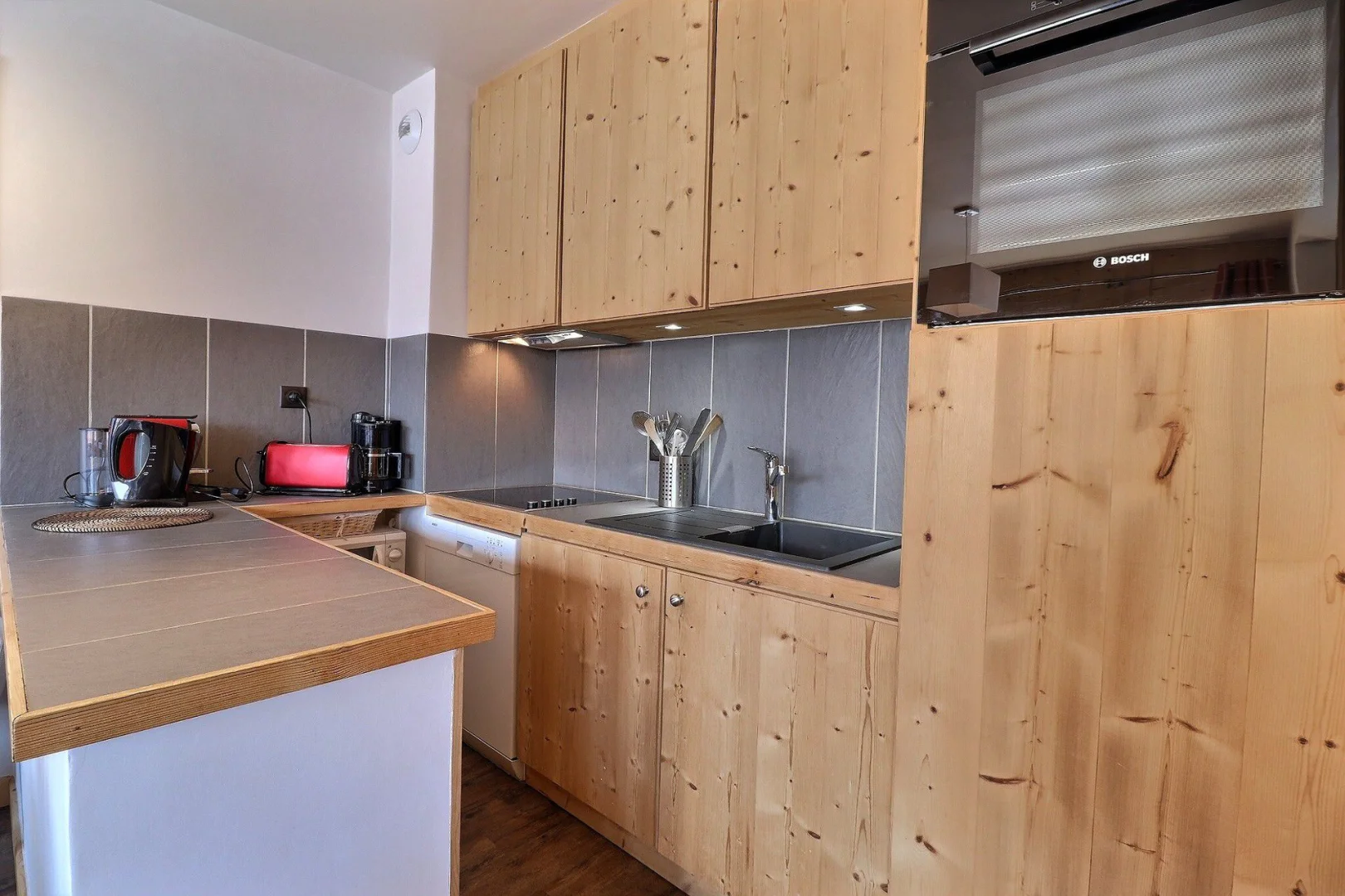 Kitchen: micro-waves/grill, fridge, dishwasher, 4 vitro-ceramic hobs, hood, Nespresso, filter coffee machine, toaster, electric kettle