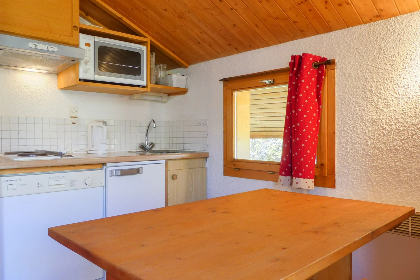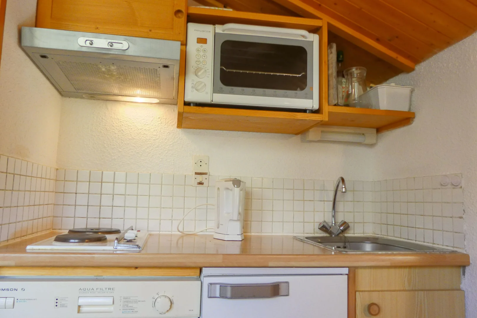 Kitchen corner: oven, fridge, dishwasher, 2 electric hobs, filter coffee machine, toaster, electric kettle, hood
