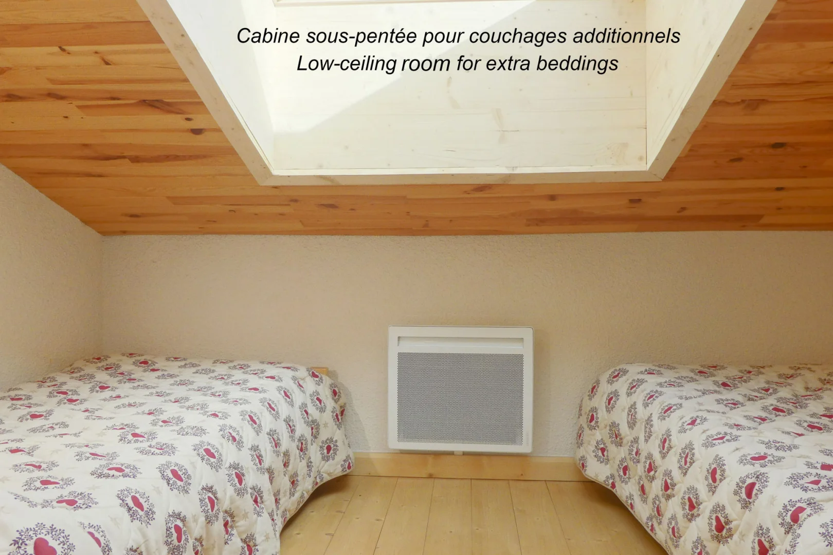 Extra beddings in an attic cabin: 2 single beds (w/fixed skylight - whole surface under 1.8m high)