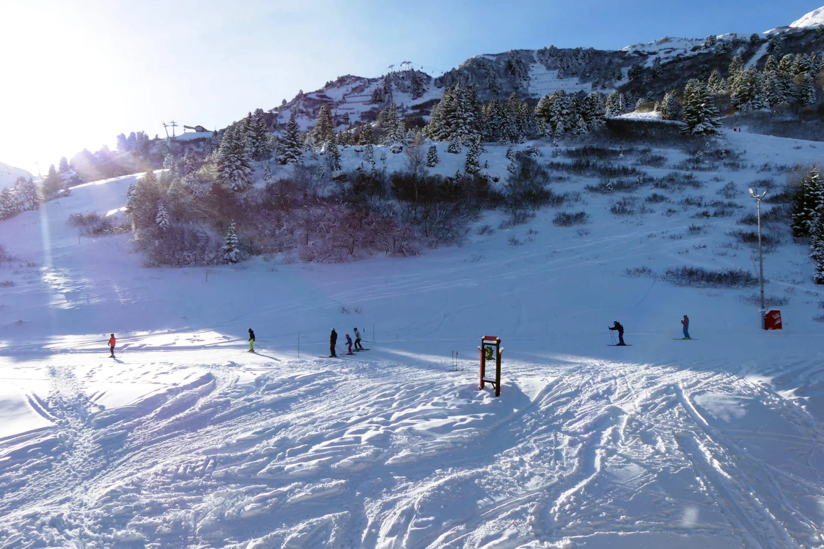 To get there from the ski lockers, you just have to walk or ski across a square and put your skis on to go down the green slope "Perdrix" and reach the main lifts.