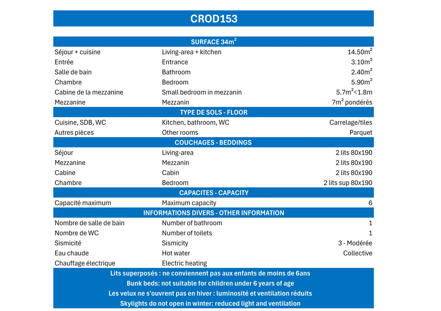 Mezzanine (fixed - skylight - very sloping celling) open on the living-room: 2 single beds,