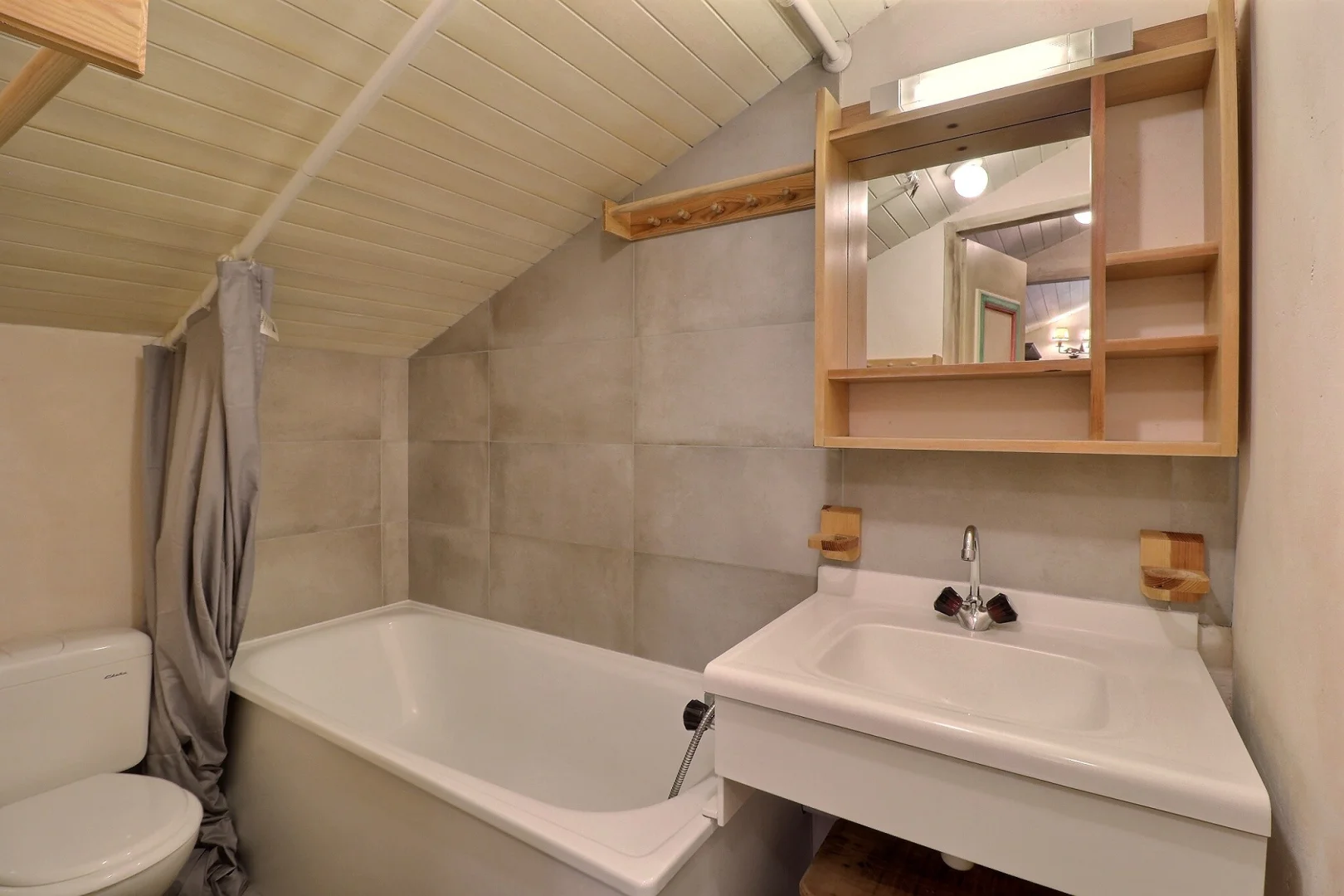 This 41m2 duplex apartment (34m2 Carrez) consists of an entrance with storage, a toilet with sink, a living room with a dining area and a kitchenette.Upstairs, there is a bedroom, a sleeping area, a bathroom and storage.